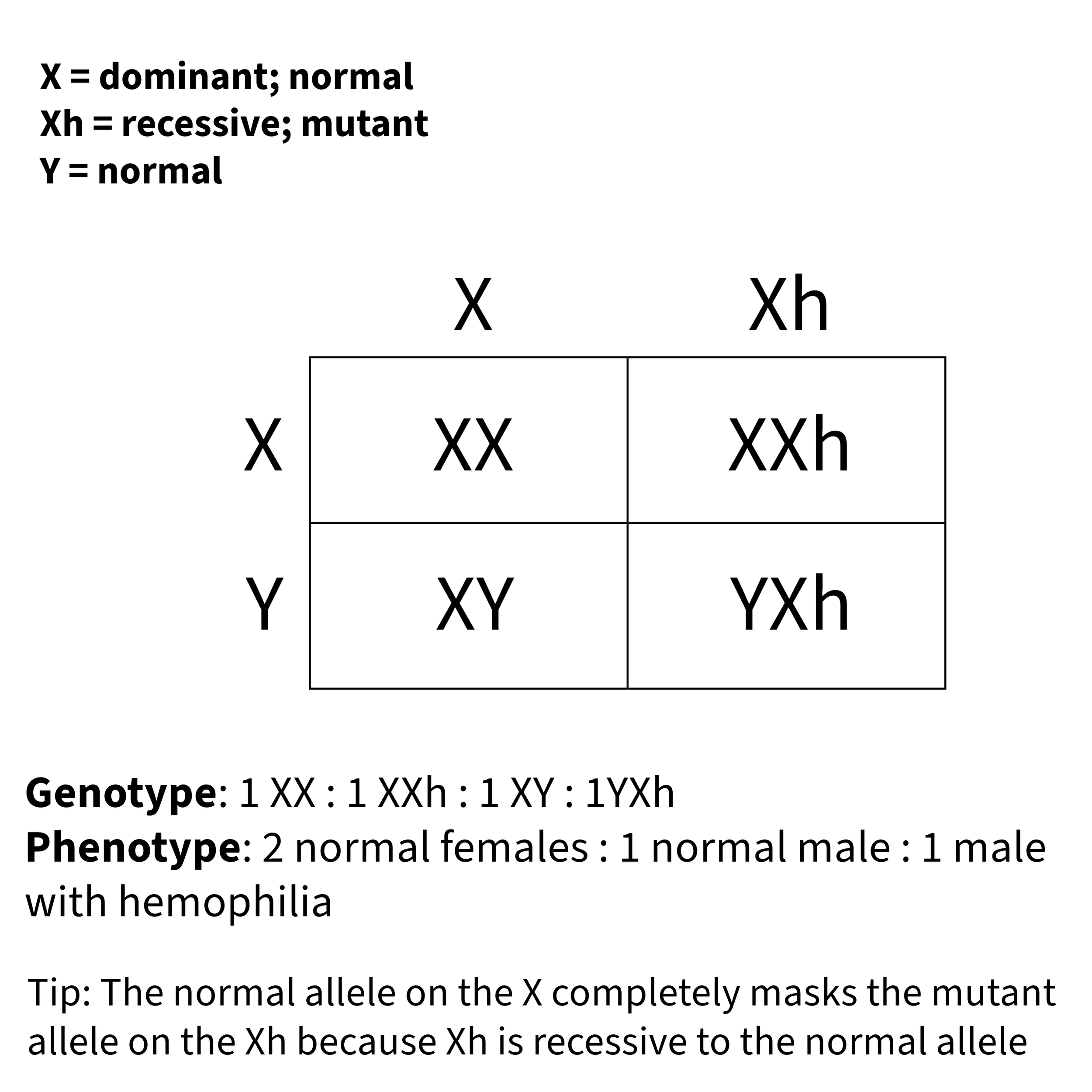 Hemophilia is a recessive genetic disease. The tricky part is that males have 1 X chromosome. If a male inherits the mutant gene on the X chromosome, he will have hemophilia because he doesn’t have another X chromosome to offset the mutated gene and make clotting factors.